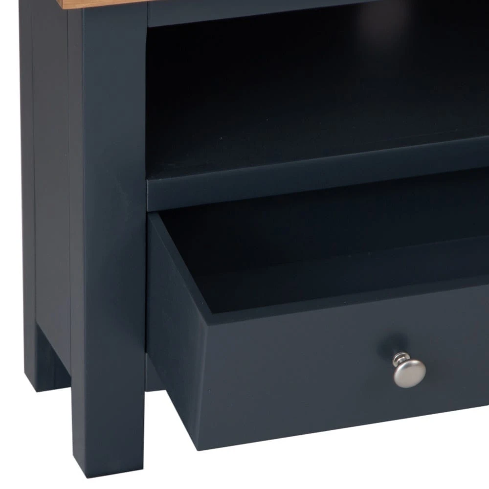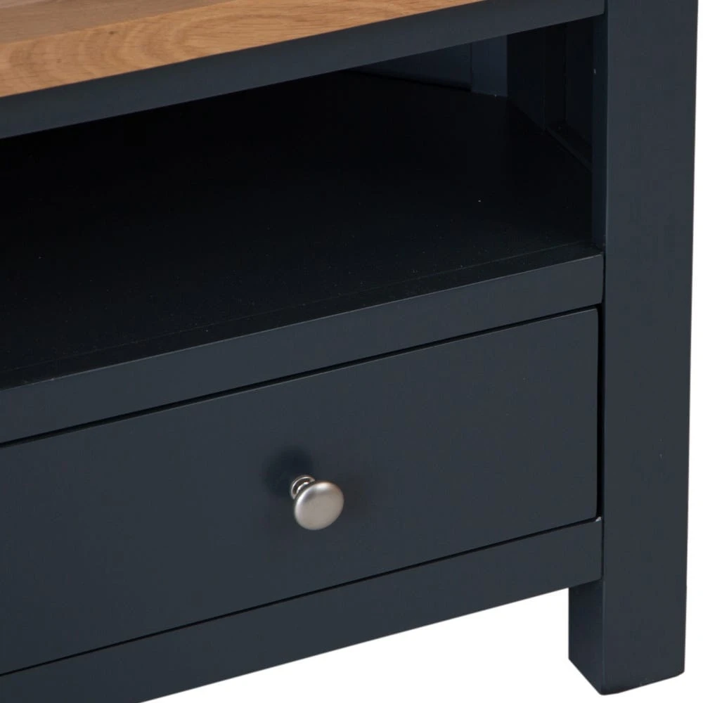 At 90cm wide, this TV unit is suitable for most mid-sized sets, with plenty of space for a few complementary ornaments. The pleasing contrast between our dark blue frame and the honey-coloured oak top complements both vibrant and minimalist spaces.