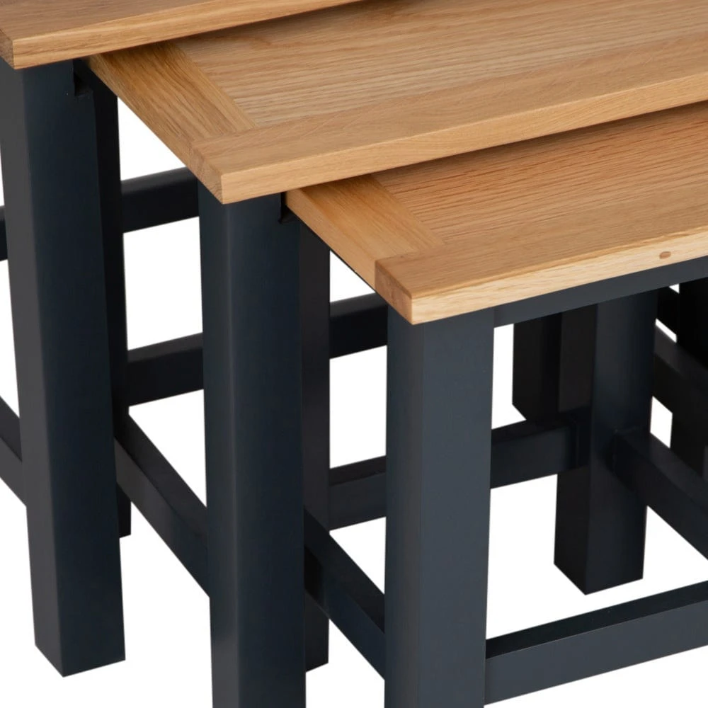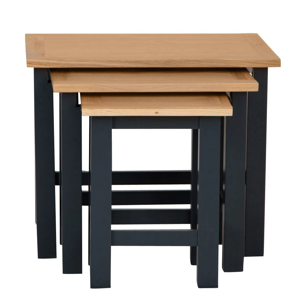 This Salisbury blue painted oak nest of 3 tables is a clever space-saver with stacks of style. Use the tables separately for drinks and snacks when you’re hosting guests or chilling out as a family. They nest neatly back together when you need to reclaim some floor space.