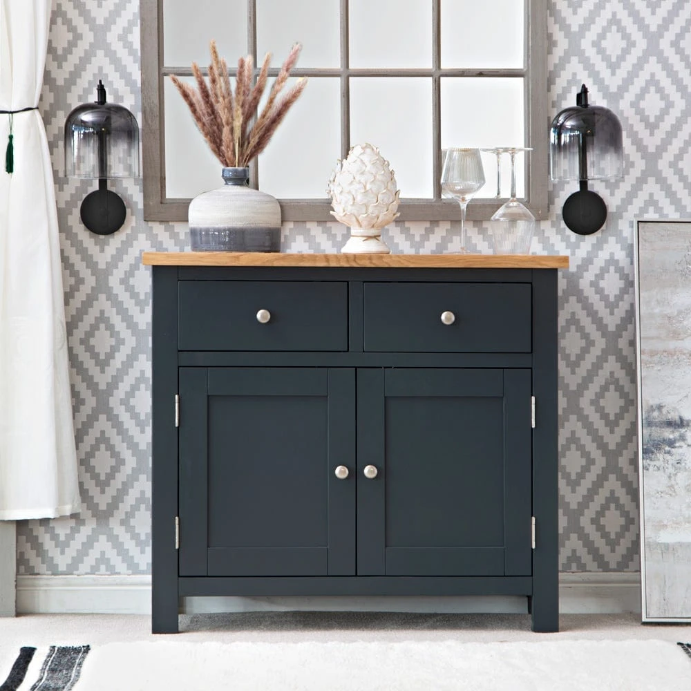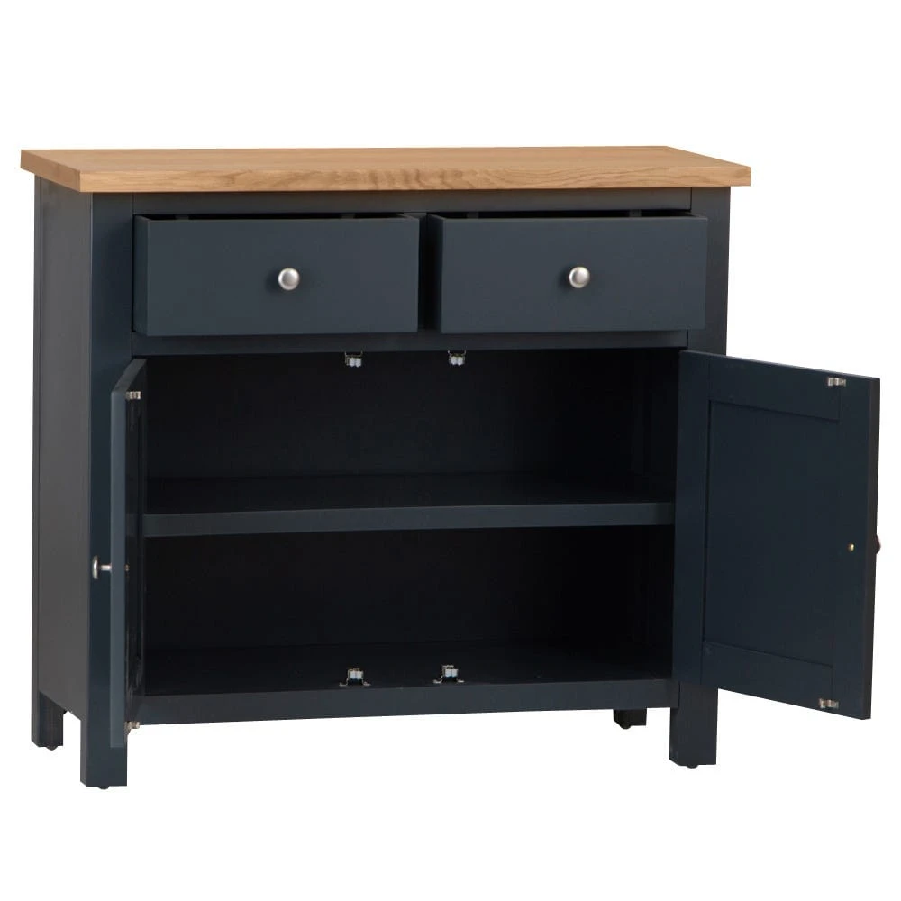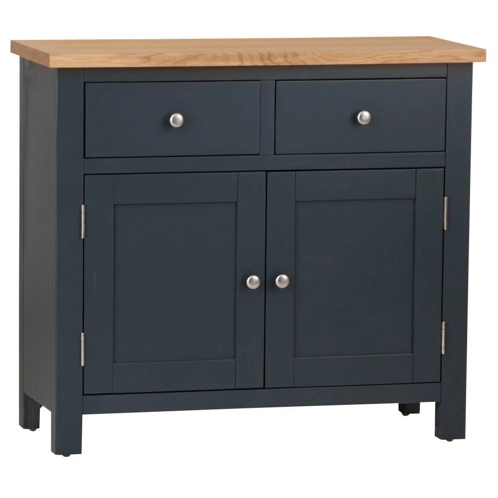 Looking for storage with a side-order of style? Our Salisbury blue painted oak small 2-door sideboard combines classic straight lines with an elegant midnight colour to transform your living room or dining space. The chrome handles lend contrasting light to the frame, and the oak top adds artisan appeal.