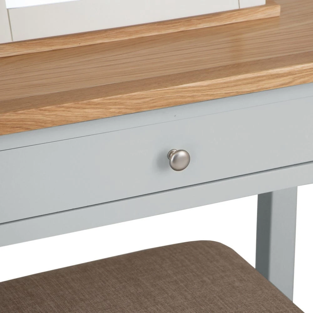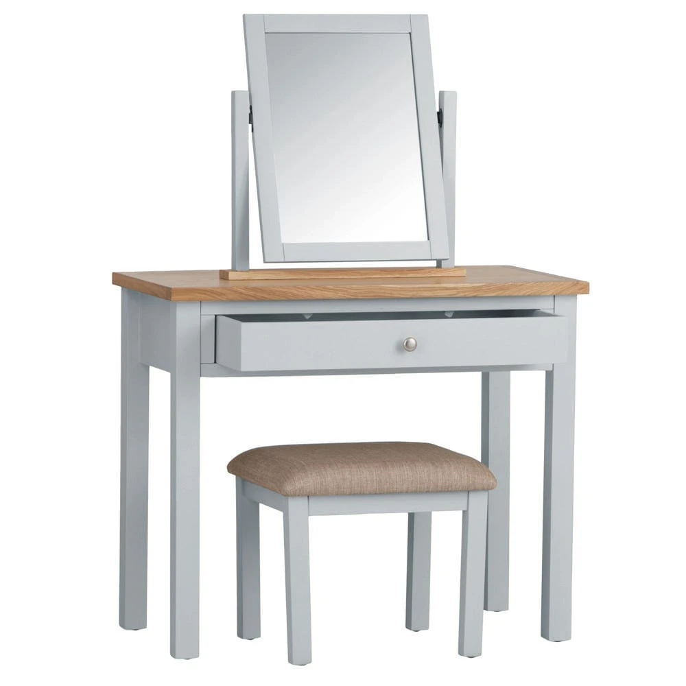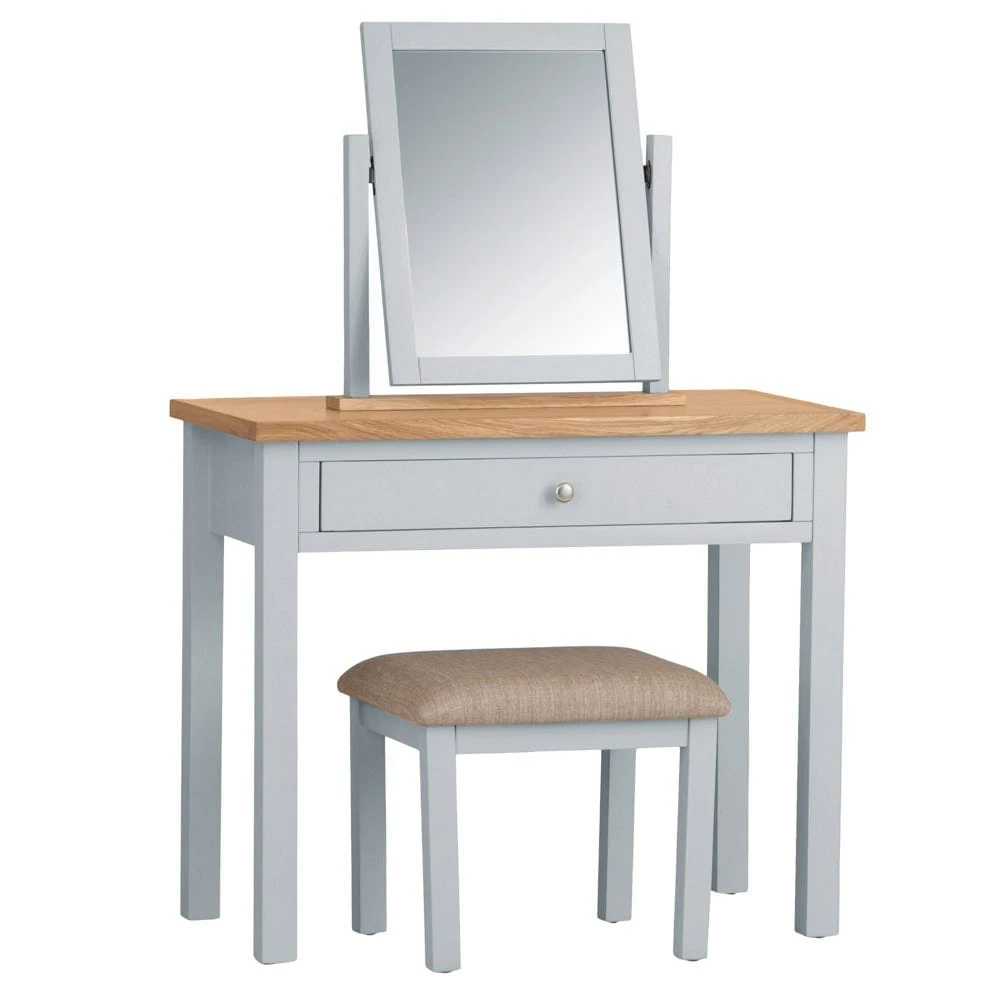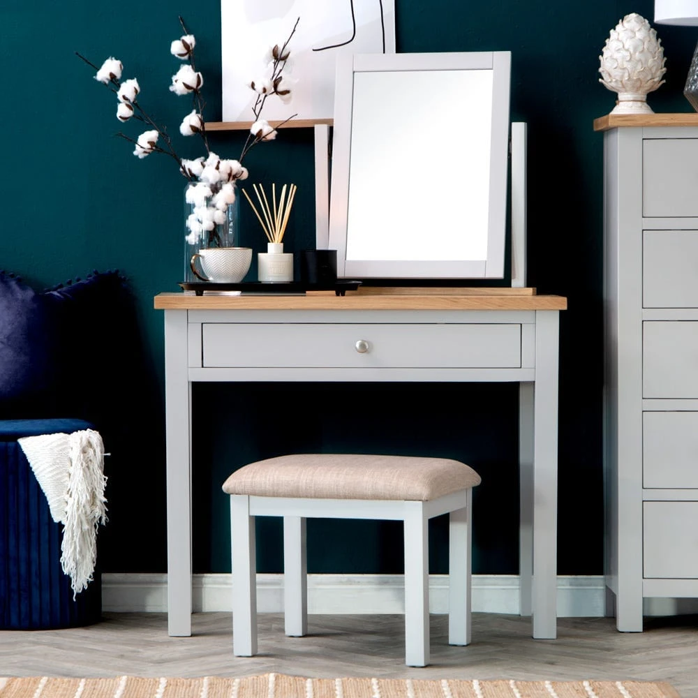 Get ready for any big day (or even bigger night) with our Salisbury grey painted oak dressing table, stool and dressing mirror. This gorgeous three-piece showcases our elegant pale grey hue, which is enhanced by the large mirror to radiate light in any bedroom. The perfectly petite stool has a plush seat that’s upholstered in a honey-coloured fabric to complement the natural oak top.