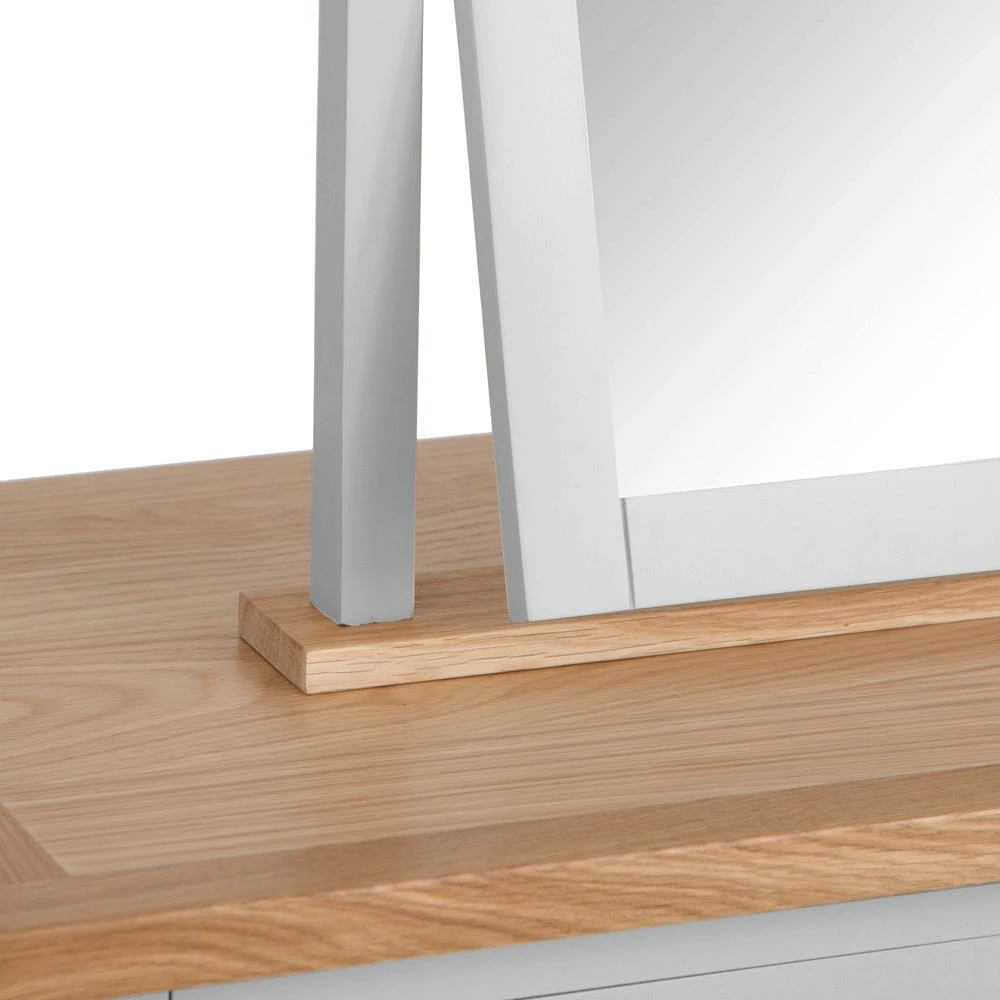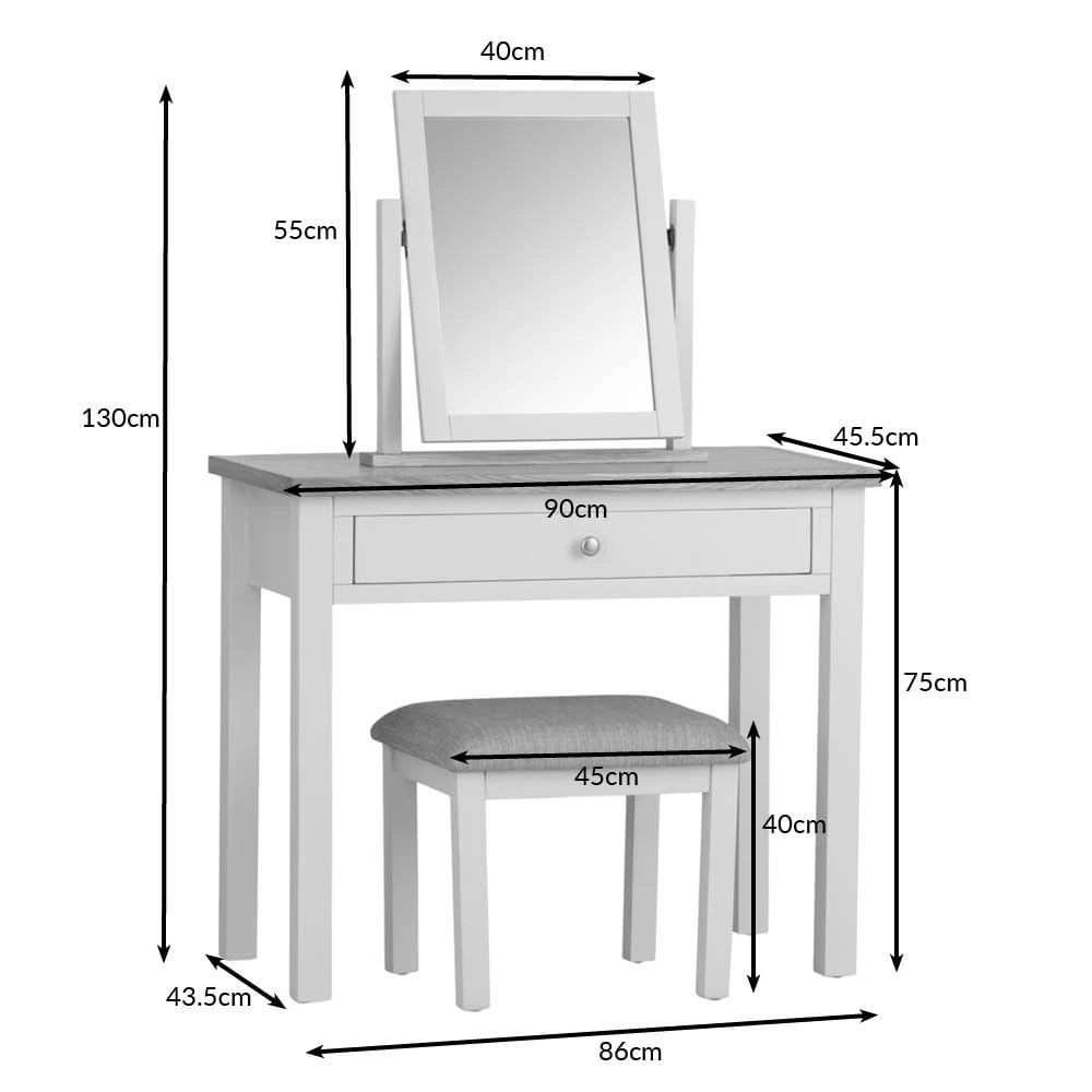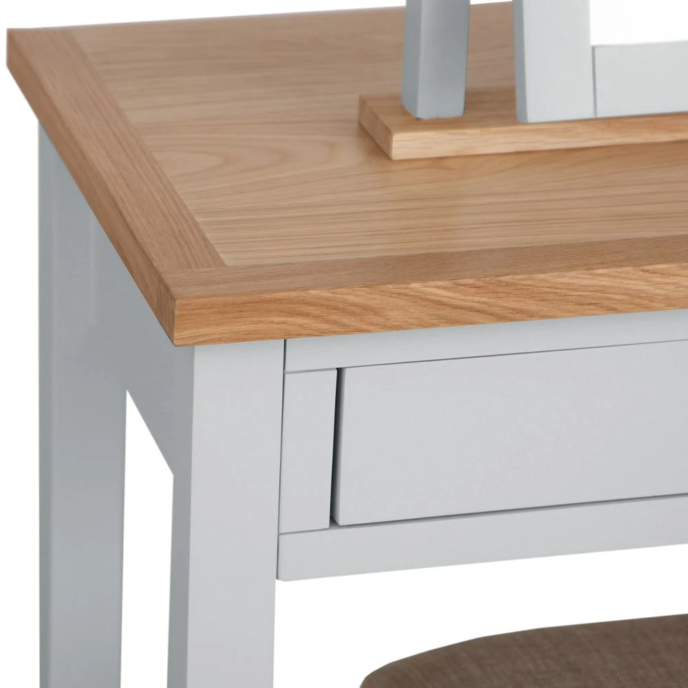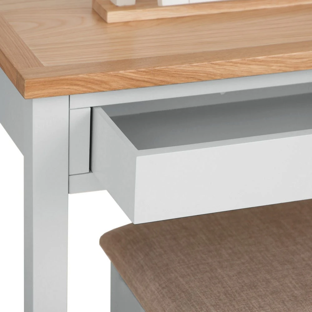 Get ready for any big day (or even bigger night) with our Salisbury grey painted oak dressing table, stool and dressing mirror. This gorgeous three-piece showcases our elegant pale grey hue, which is enhanced by the large mirror to radiate light in any bedroom. The perfectly petite stool has a plush seat that’s upholstered in a honey-coloured fabric to complement the natural oak top.