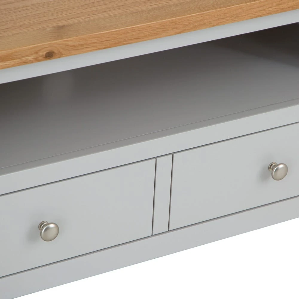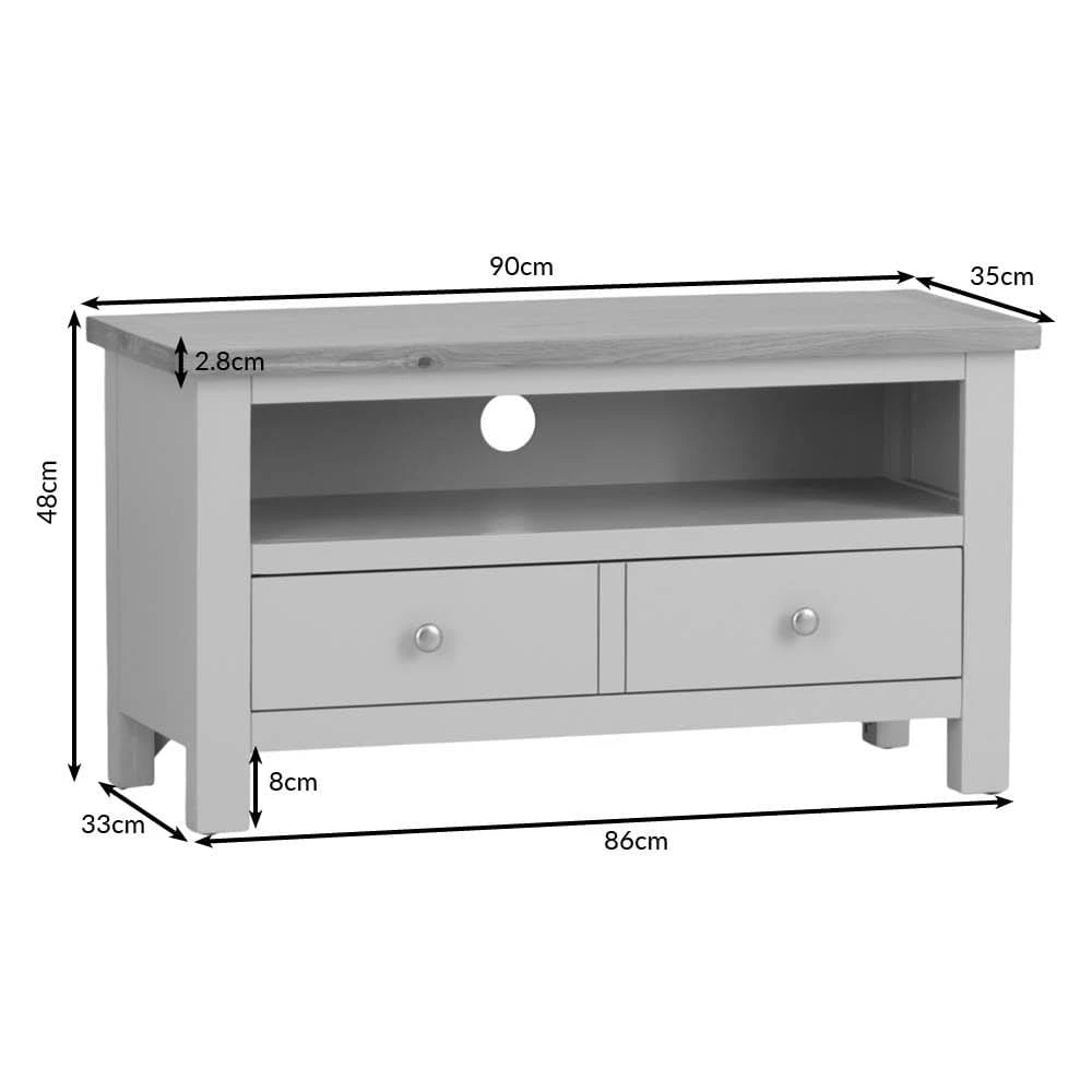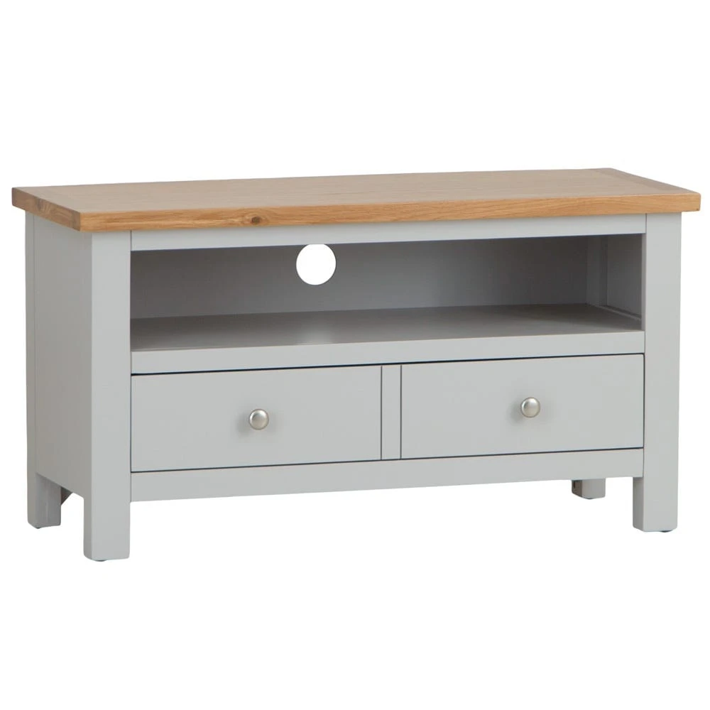 At 90cm wide, this compact unit is ideal for small living rooms or bedrooms, and can accommodate standard 24-inch TV sets. It has a large double-fronted drawer for your DVD or Blu-ray collection, plus a shelf that’s designed to house players and games consoles. The pale grey hue exudes subtle elegance to flatter any style of space, and the golden oak top adds complementary warmth.