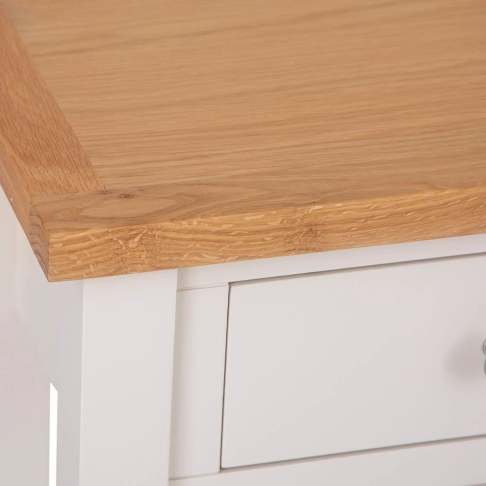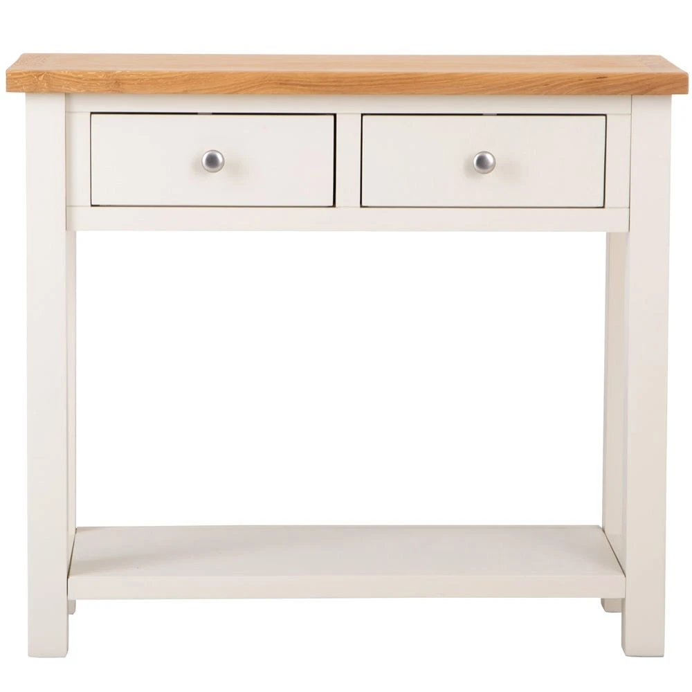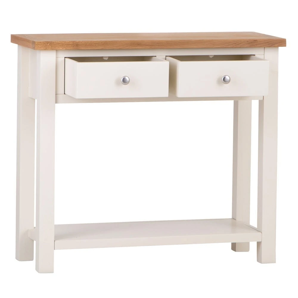 Keep our Salisbury ivory painted oak console table in your hallway and guarantee a cheerful greeting whenever you get home. The elegant ivory finish brightens up any space, and the natural oak top adds a rustic feel. Chrome knob handles bring a touch of finesse to this versatile piece.