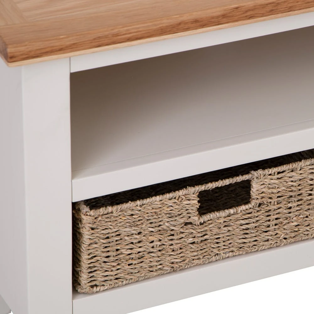 The clever D-shaped top lets you position this unit in any corner of your home, and the classic ivory hue brightens up any living room. Our natural oak top and seagrass wicker baskets bring some artisan charm to the sophisticated finish. Keep books and games in the baskets, and stow your players and consoles on the specially designed shelf.