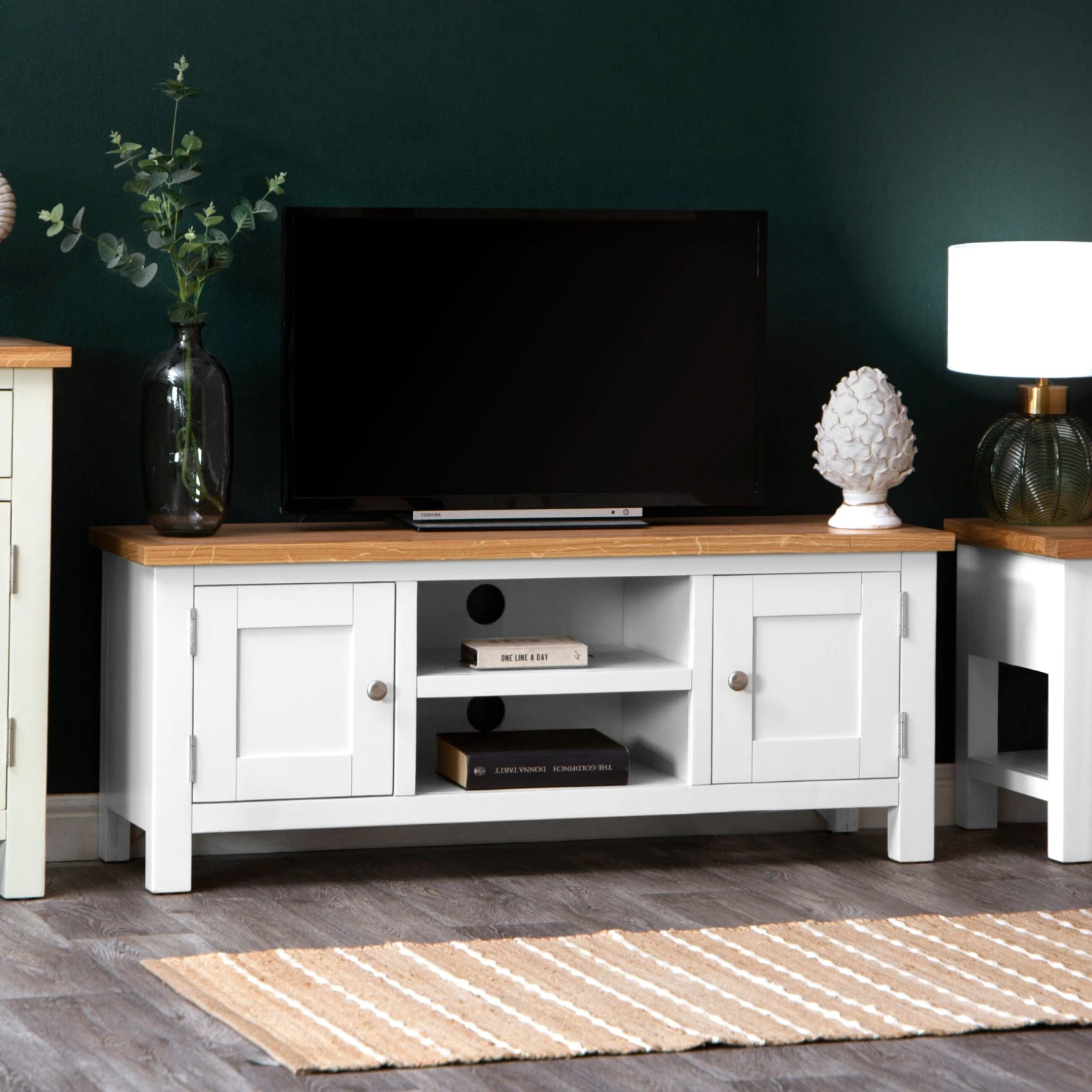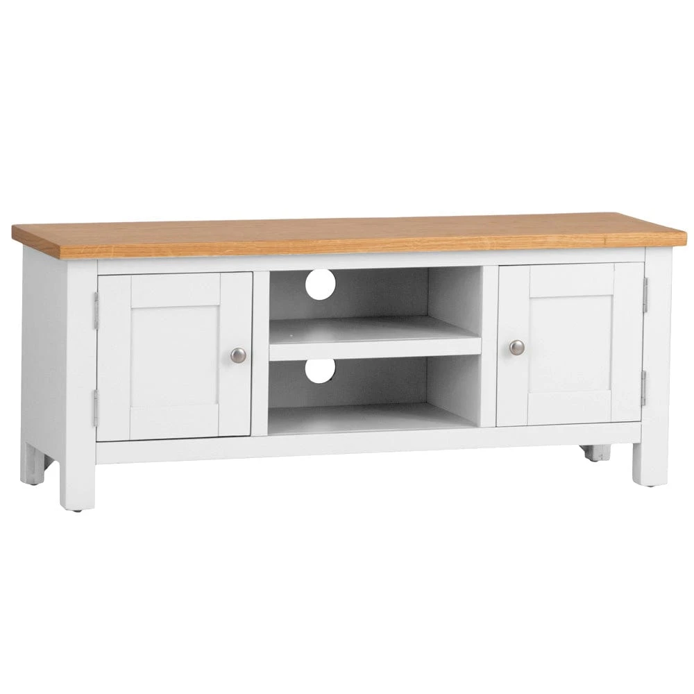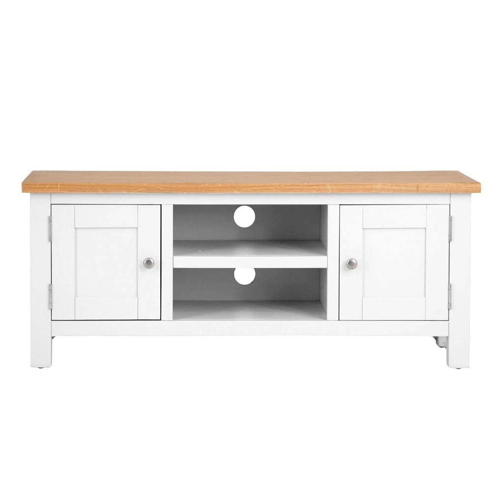 This Salisbury White painted oak large TV unit sets an elegant scene for both family film nights and peaceful solo screenings. The White finish brightens low-lit corners and makes a striking contrast to dark screens. Our distinctive natural oak top provides sturdy farmhouse-style appeal, with plenty of room for a widescreen TV and a few of your favourite baubles.