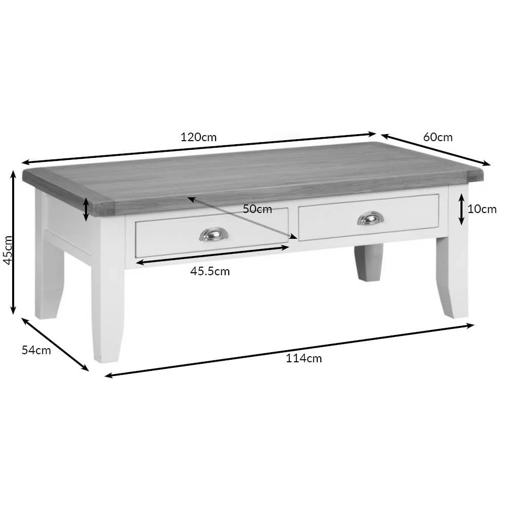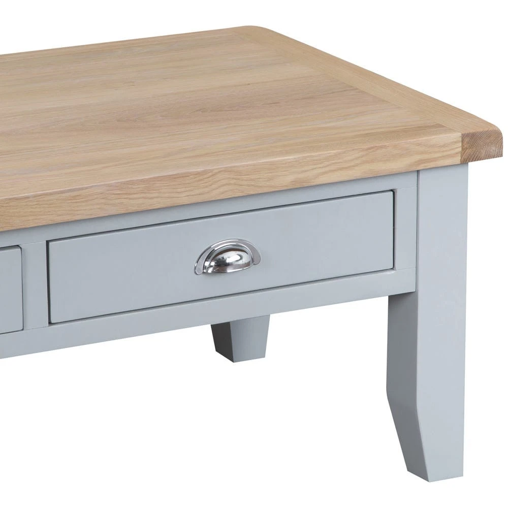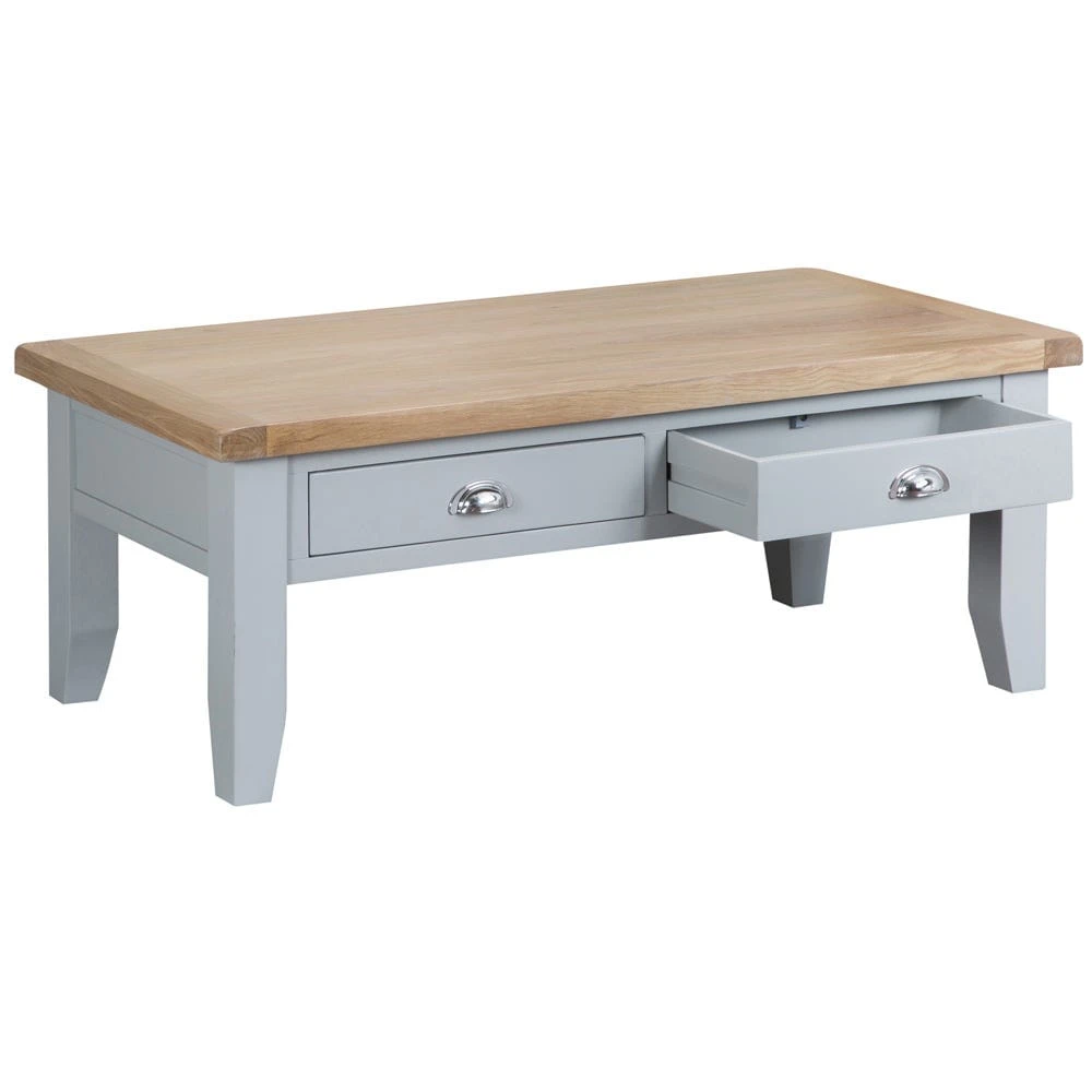 Wide, low and really rather attractive, the Suffolk grey painted oak large coffee table makes the ideal centrepiece for morning elevenses or an after-dinner digestif. Our airy pale grey finish suits both contemporary and classic interiors, and the rustic oak top has a traditional artisan feel.