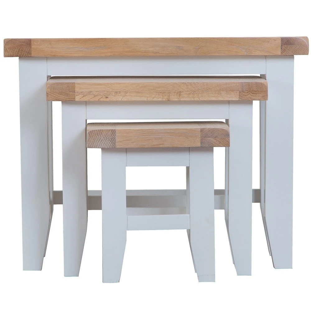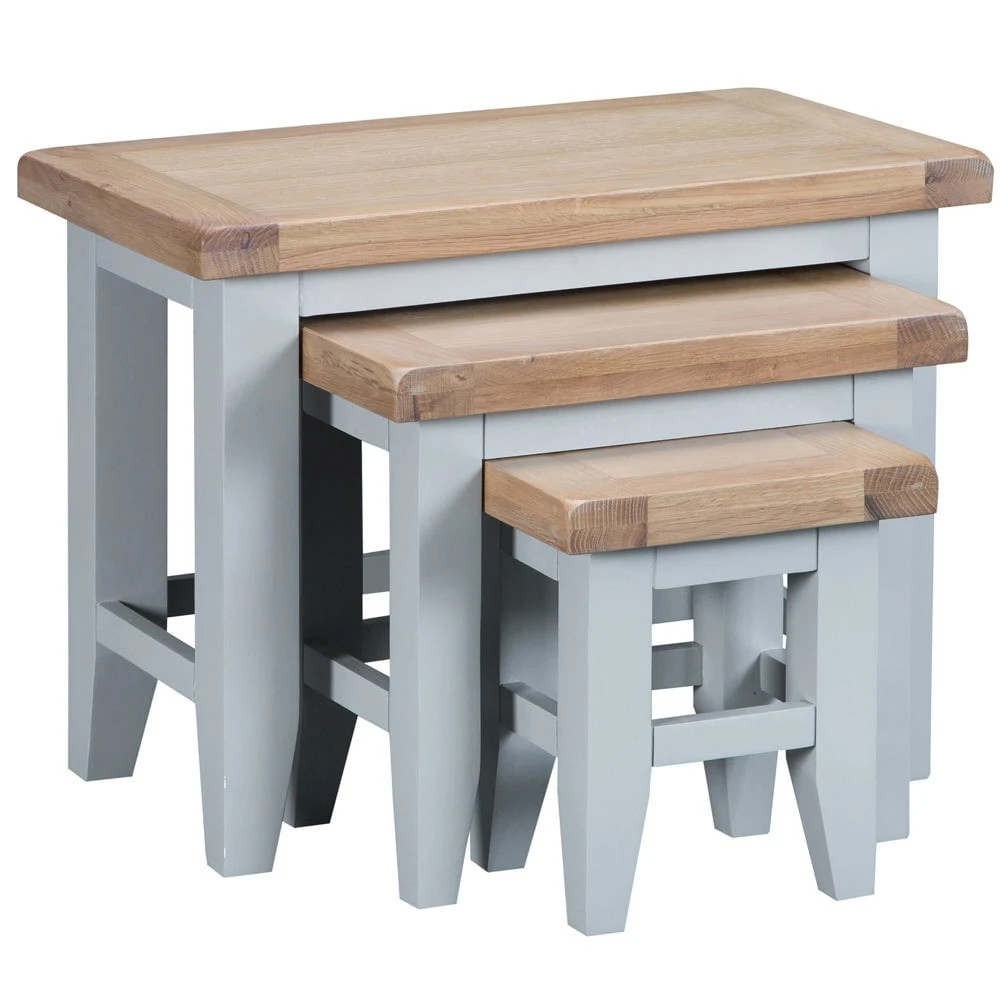 Never mind Goldilocks, this Suffolk grey painted oak nest of 3 tables is just right. Pull out the smaller two to accommodate mugs of coffee when guests pop round, and slide them neatly back together when you no longer need them. Alternatively, use them as separate display tables for pics or a lamp.