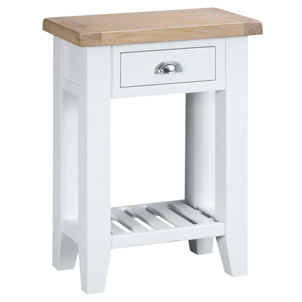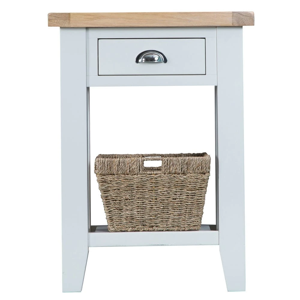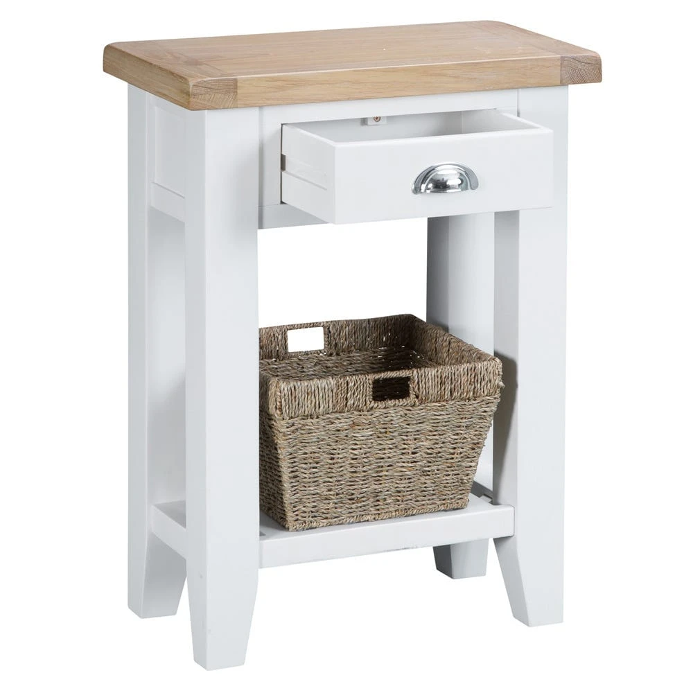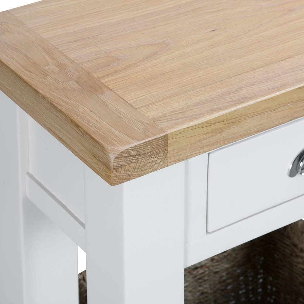 Do you have an old-school telephone that deserves more attention than it currently gets? Just place it on our Suffolk white painted oak telephone table with wicker basket in your hall to make sure guests notice it as soon as they enter.