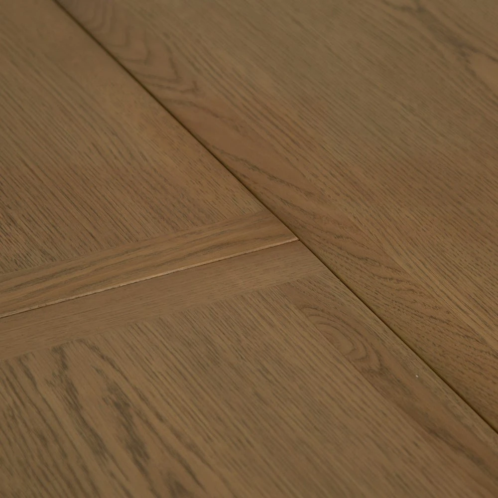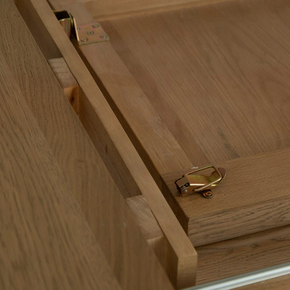 It already packs a sizeable punch at 2 metres, but once extended it adds a further 50 cm to its heft. Extending is a breeze: aluminium ball bearing runners make everything go smoothly, while hidden butterfly mechanisms keep the technical bits out of sight. This means you can focus on the table’s beauty: rustic-inspired solid wood with a smoked grey colour, traditional crossed legs and subtle round edges.