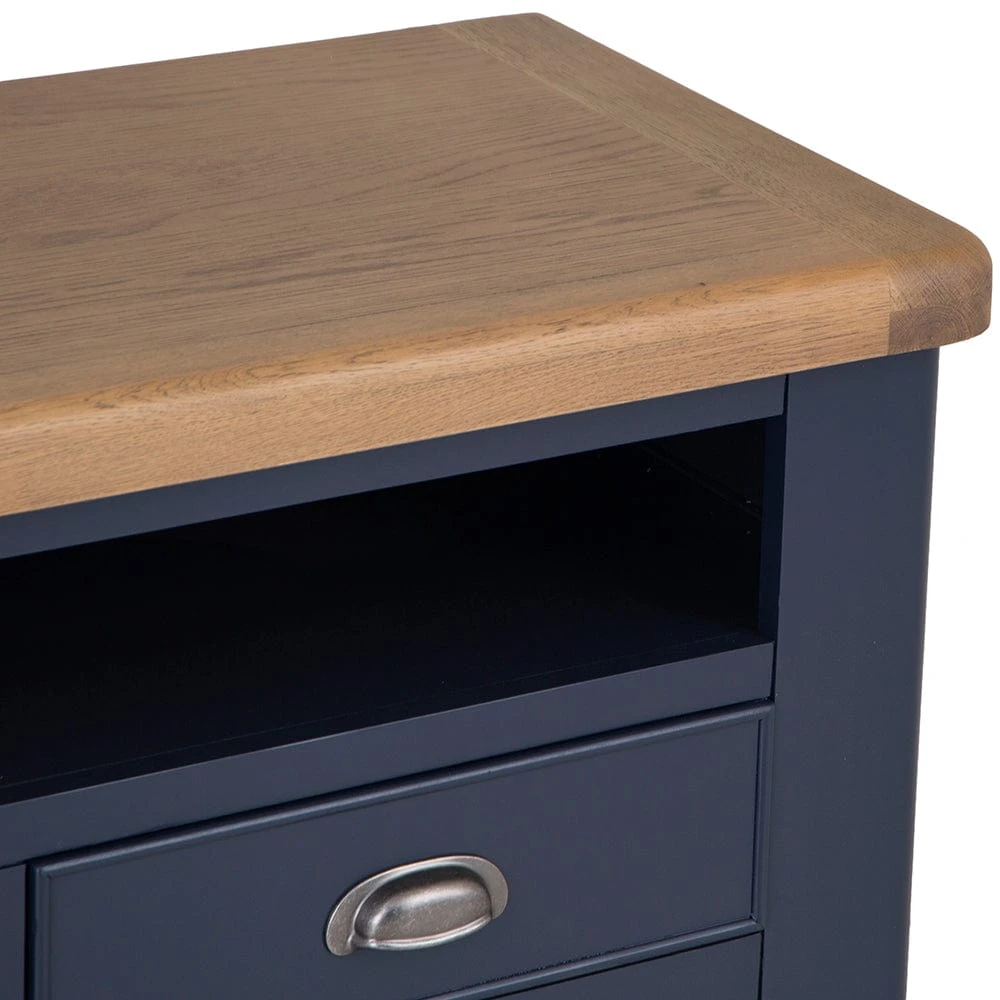 Indulge yourself in a little bit of luxury. Our Wessex Smoked Oak Blue Painted Collection exudes class and style with its chunky oak frames, smooth rounded corners and unique appearance. The smoked colour of the wood is unlike any of our other collections, and this uniqueness transcends itself across the range with a host of statement pieces you won’t find elsewhere. Flagship items in this gorgeous oak Bedroom, Living and Dining furniture collection include a super-size Larder Unit, a cleverly designed Extra Large Tall Drinks Cabinet and an eye-catching Sideboard Wine Rack amongst other traditional oak furniture items. The deep blue painted frames make this gorgeous collection an elegant addition to the home. This range is available in an unpainted oak finish, called Wessex Smoked Oak.