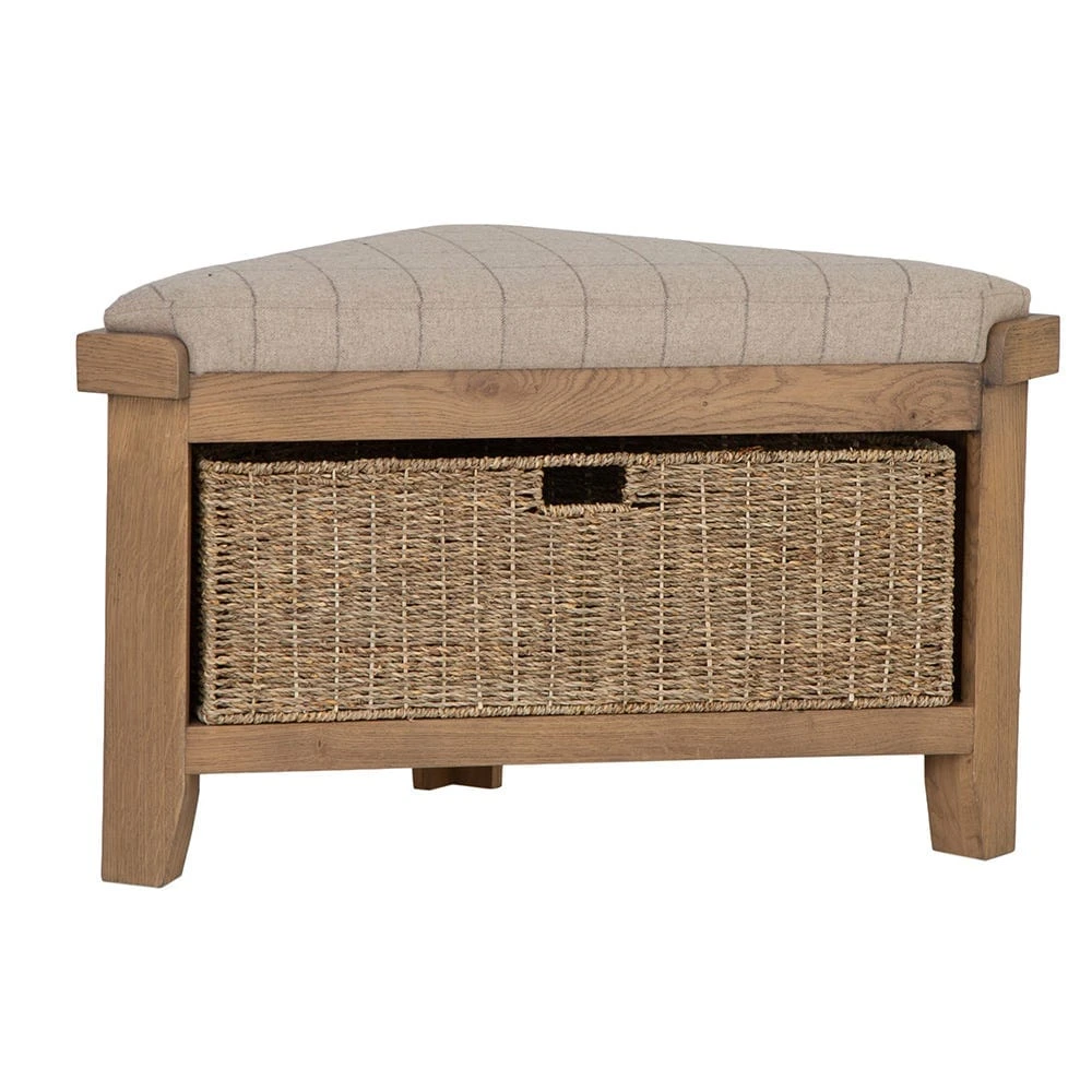 Place the Wessex smoked oak corner hall bench with wicker basket in your window nook so you can look out over the view with a cup of coffee and a book. This solid wood bench works just as well as a seat as it does as a convenient storage chest.