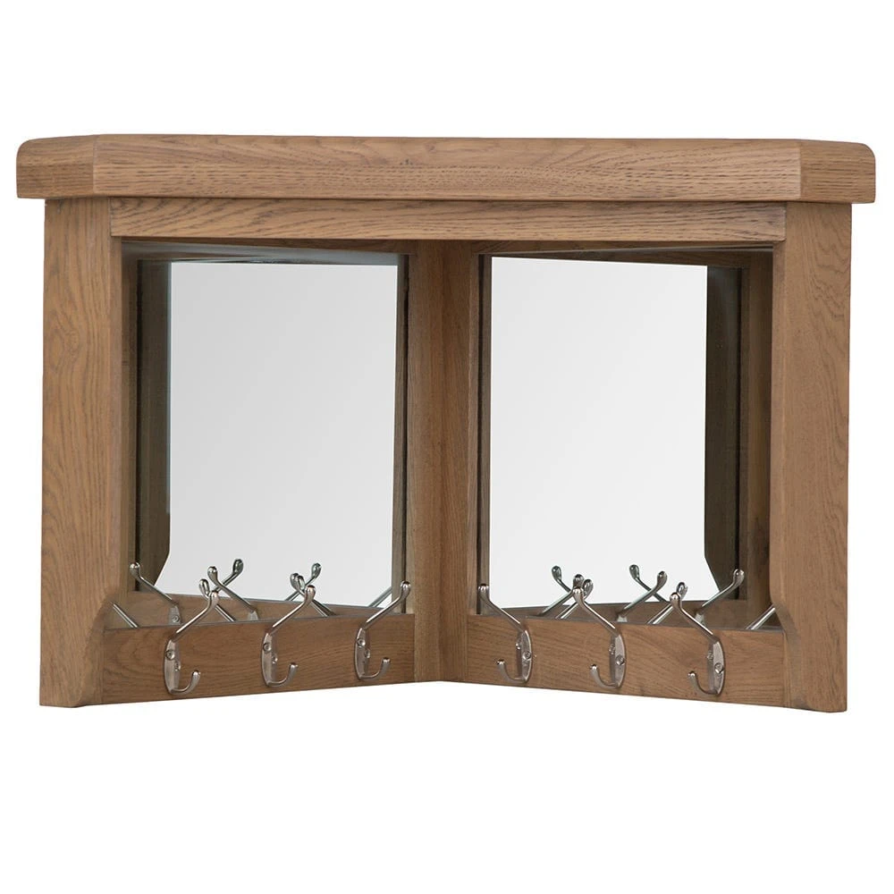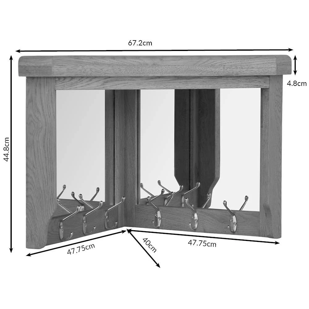 There are so many things to check before leaving the house: keys, scarf, phone, dog lead. Make life just a little easier with one of our Wessex smoked oak corner mirrored coat racks. Slotting straight into a corner, this useful rack can be your last port of call before departing.