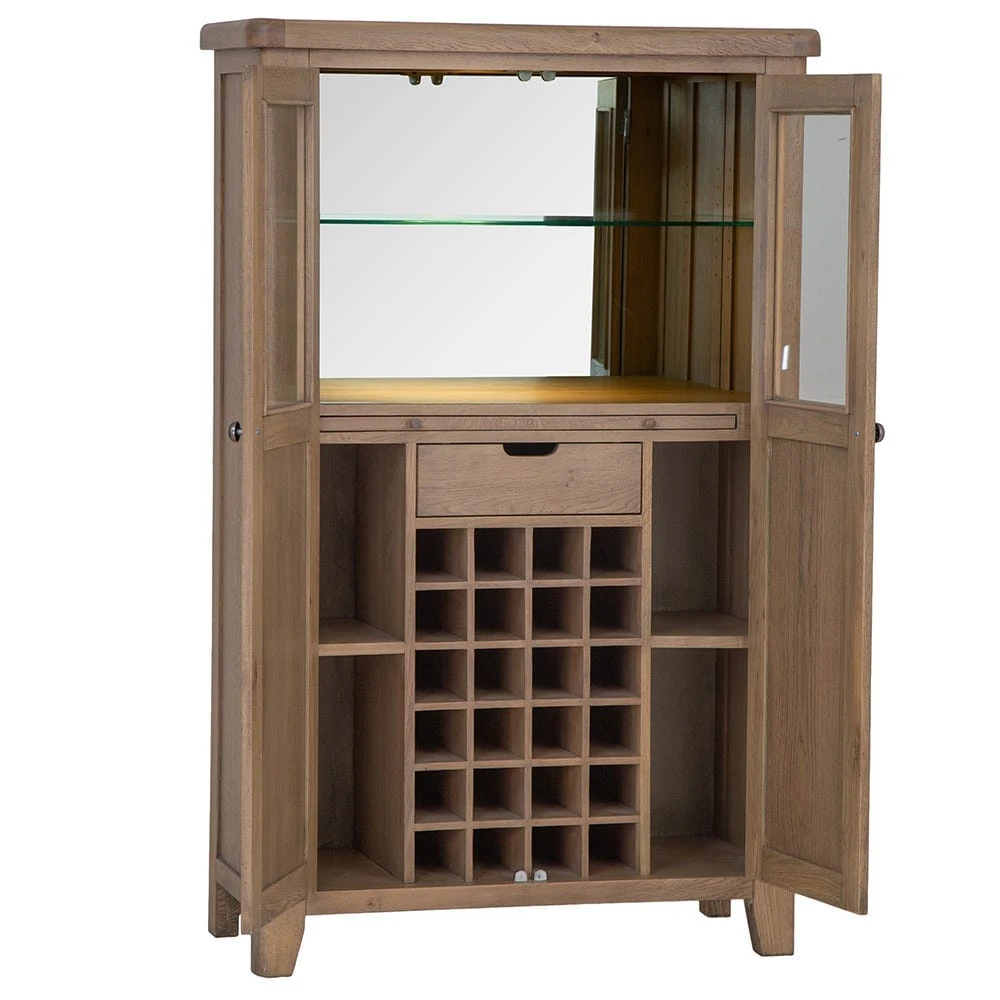 Embody the glamour of an upscale bar in your own living room. Our Wessex smoked oak extra large tall drinks cabinet is a sophisticated way to enthral your guests at your next get-together. Its natural grained wood design brings a sense of country home furnishing to your room.
