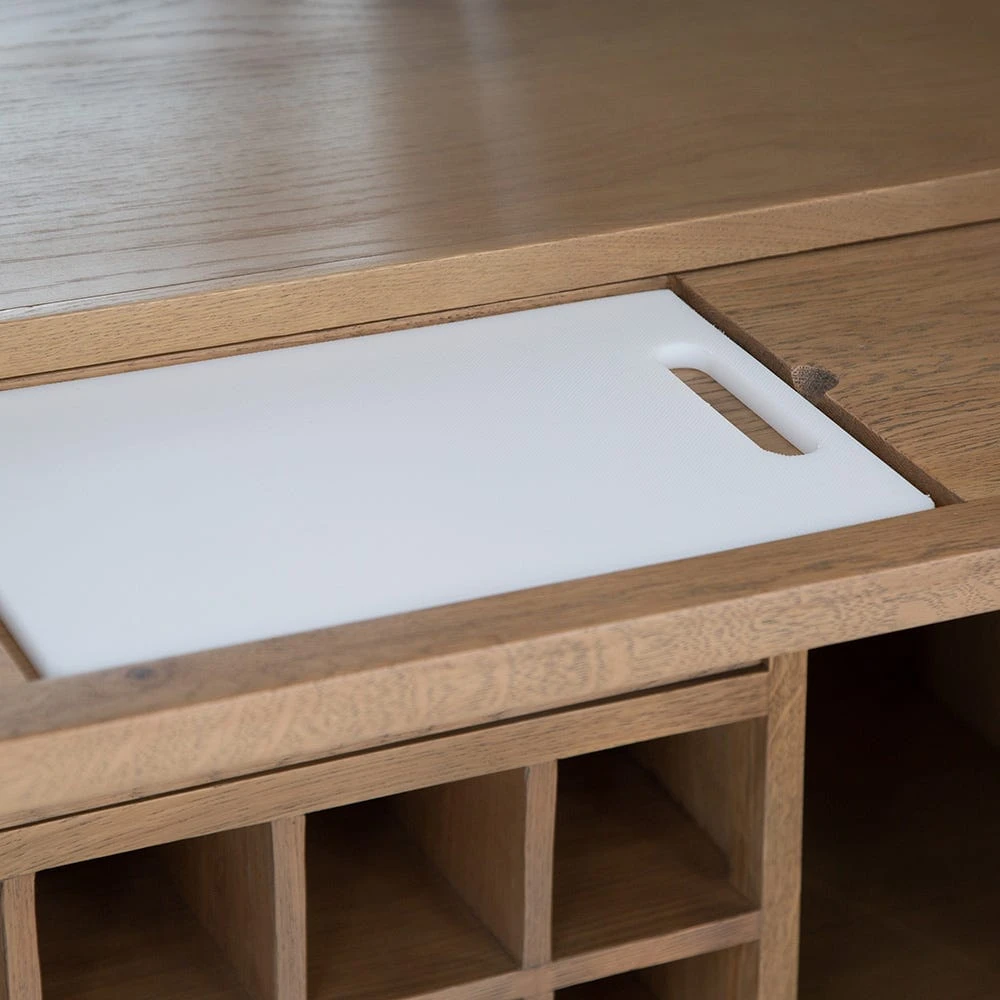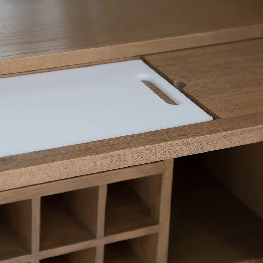 Open the two glass-windowed doors to reveal a wealth of storage. Twenty-four slots for wine or liquor bottles are one of the main features, with four presentation shelves at the sides, plus a handy drawer for bottle openers and corkscrews near the top. The upper level has one wooden and one glass shelf with a mirrored back and fabulous LED downlights that take the wow-factor up to 11.