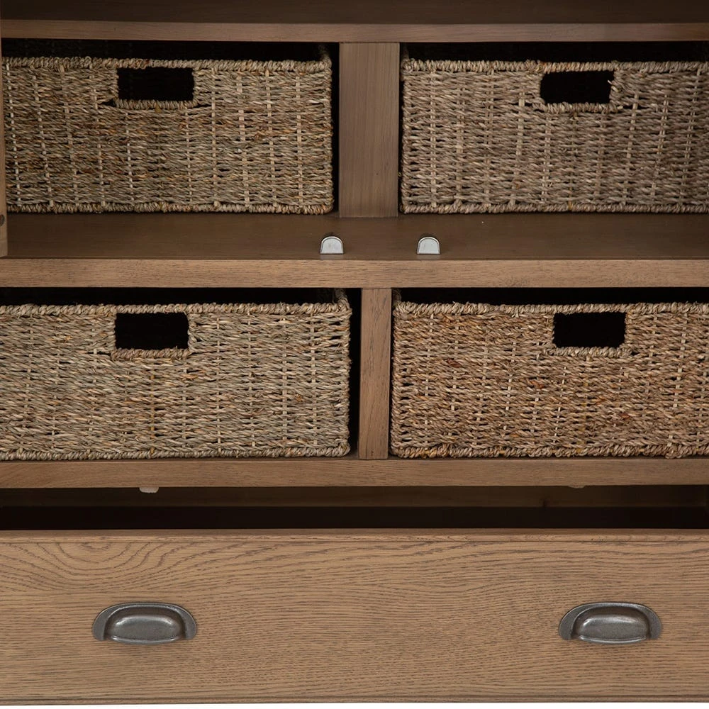 Fresh produce can be tucked into the four wicker baskets which have their own alcoves: two in the main cupboard and two beneath this. A final 85cm x 45cm drawer for pots and pans completes this magnificent, smoked-oak coloured unit.