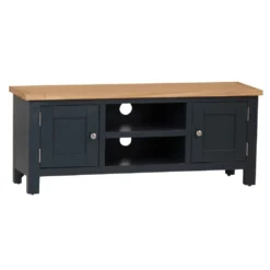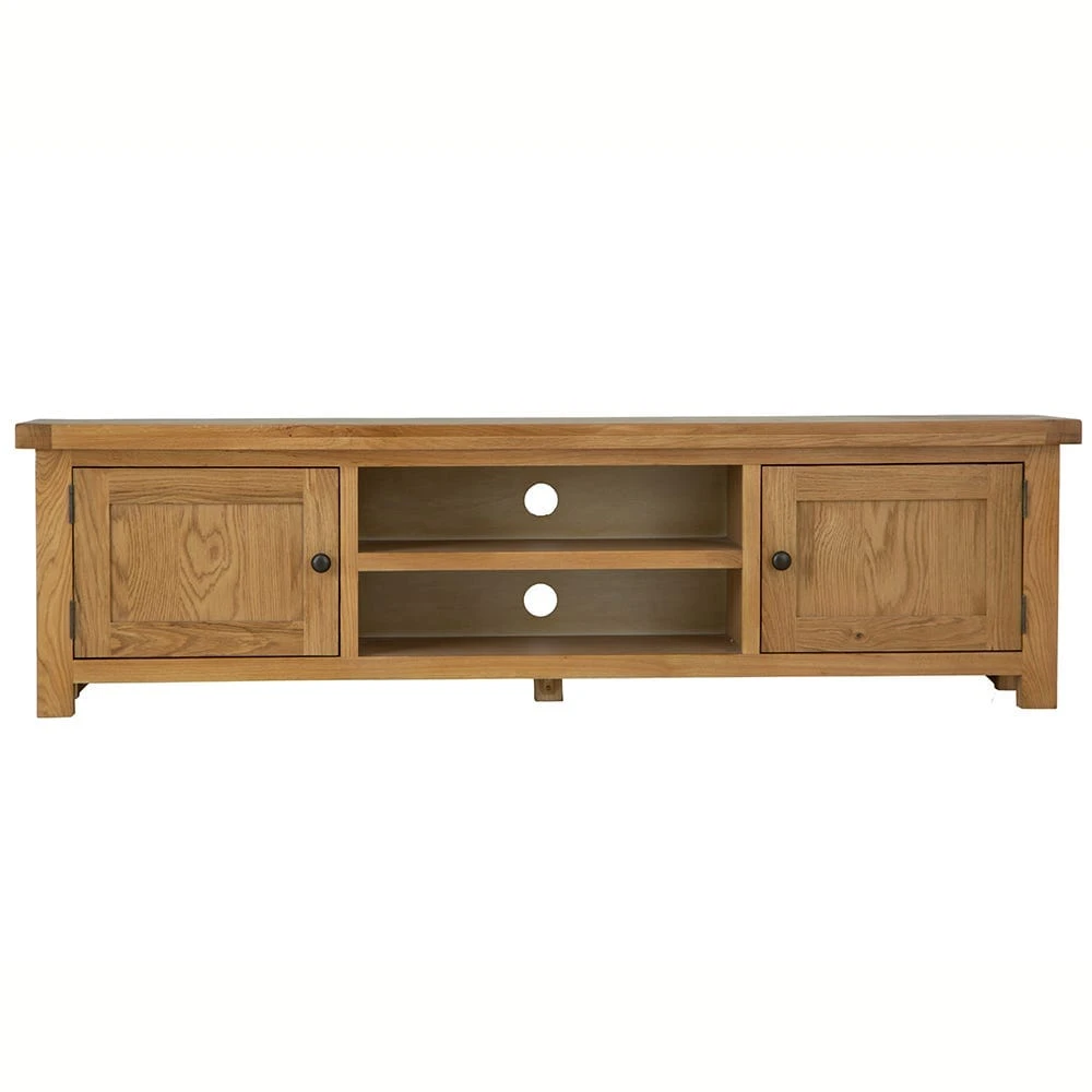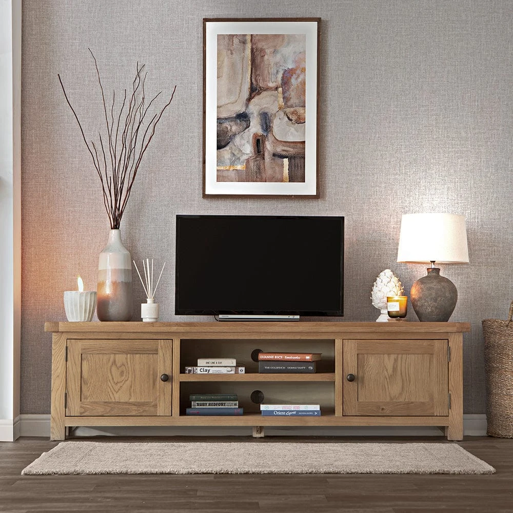 Nothing says ‘cosy night in’ like our Winchester oak extra-large TV unit. Whether you’re hooked to a crime drama or hosting a film night for friends, it’s got the tricks – and the looks – to enhance your evening entertainment. At 180cm wide, this unit is ideal for large TV screens up to 65 inches wide, with a pair of cupboards for your remote controls and central shelves for games consoles and pads. The honeyed hue of our solid oak and oak veneer composition enhances any living room, while the chunky legs and brass-effect handles add rustic charm.